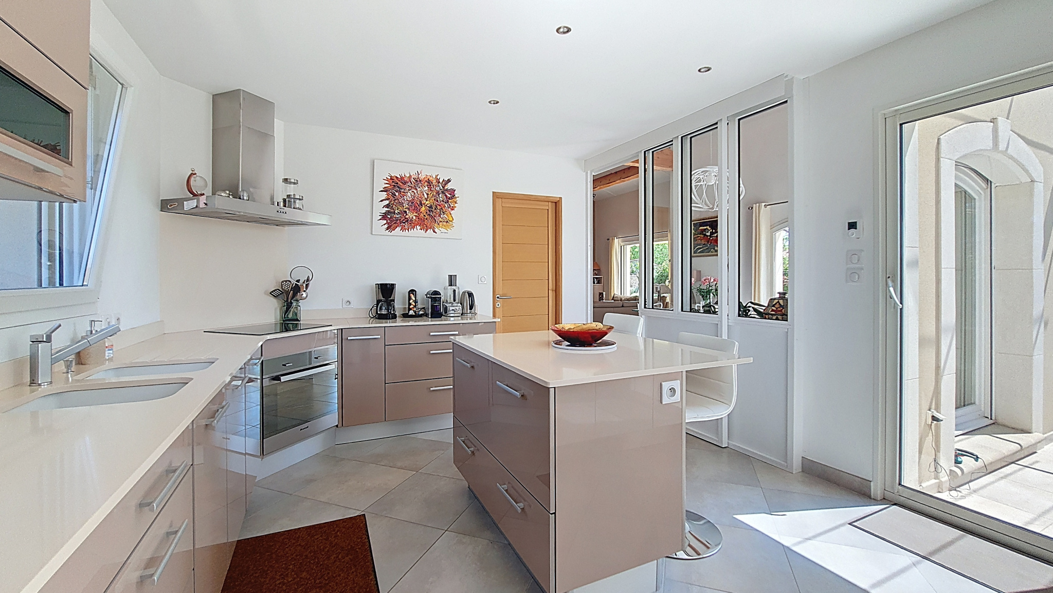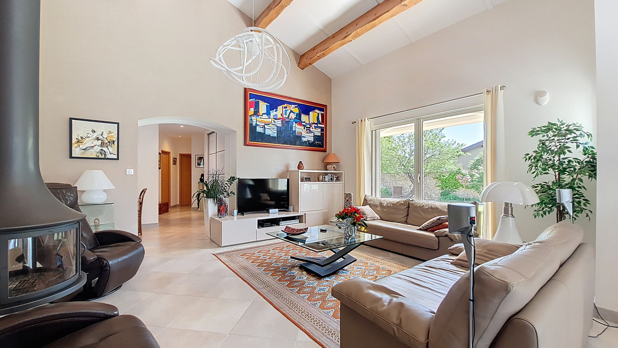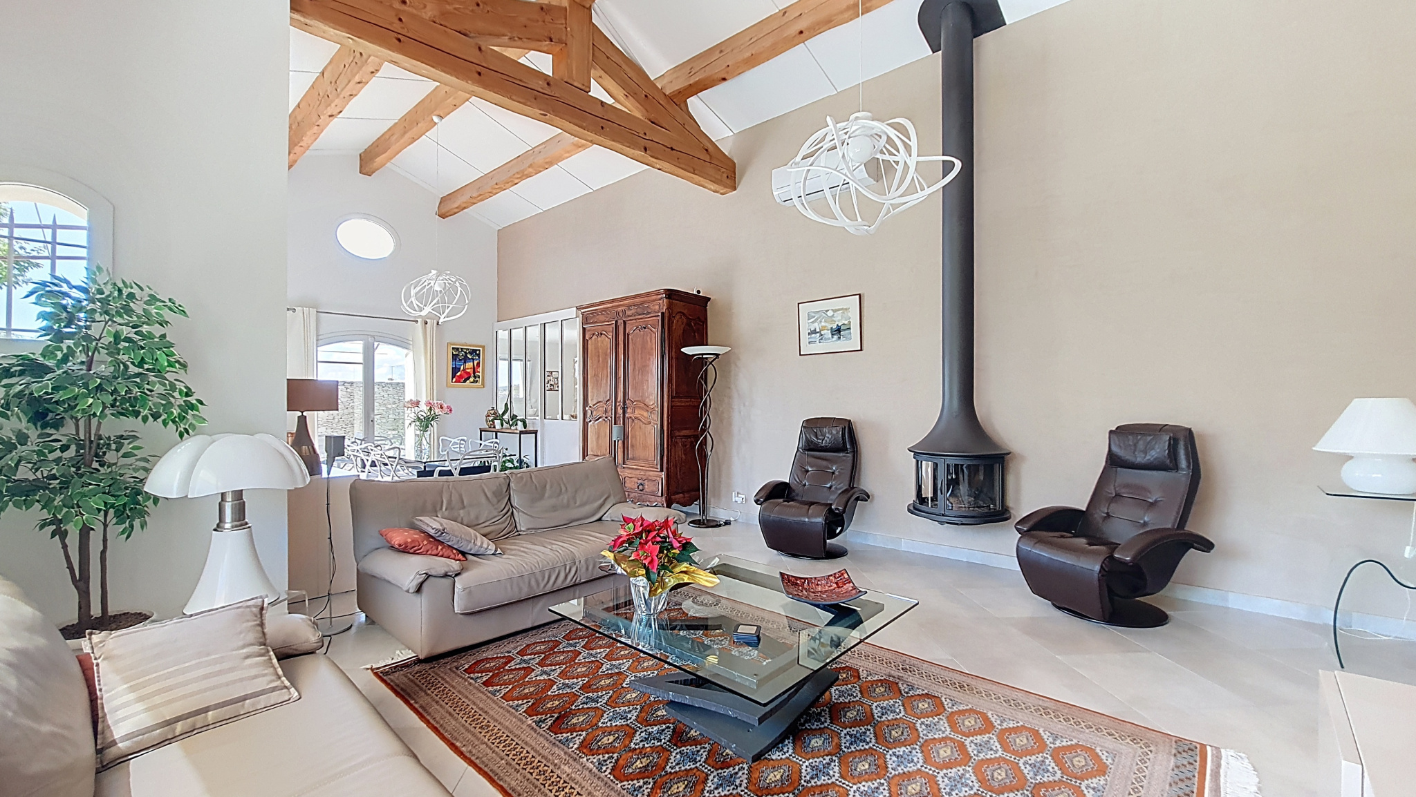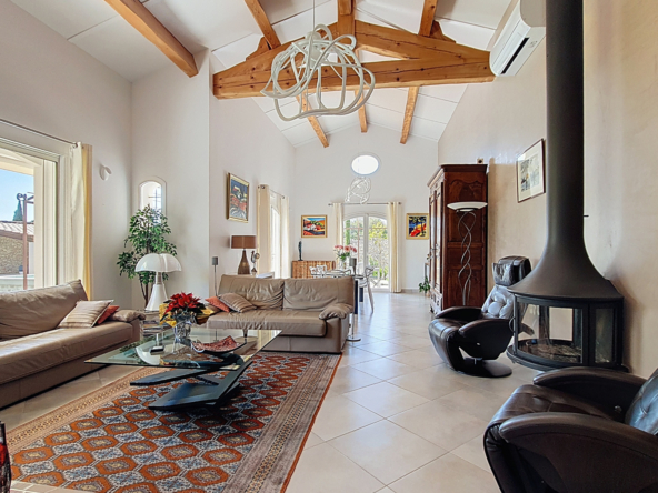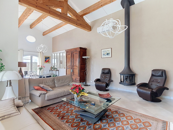 La maison se compose: d’un vaste et lumineux séjour-salle à manger agrémenté d’un impressionnant plafond cathédrale, créant un volume et une atmosphère unique , d’une cuisine entièrement équipée donnant accès sur une terrasse.