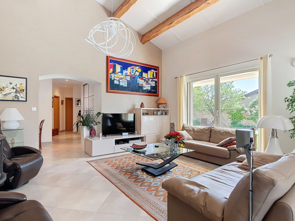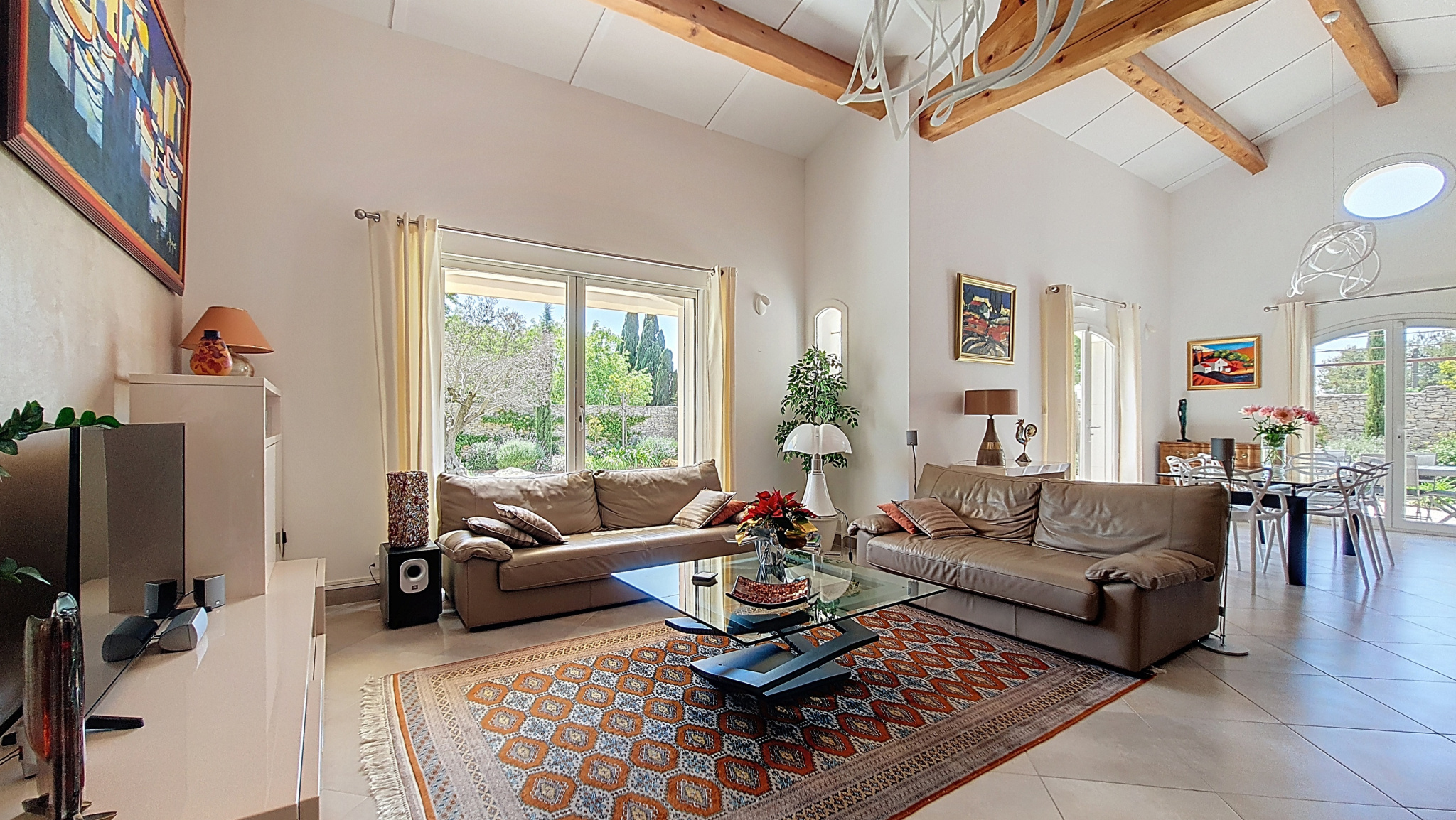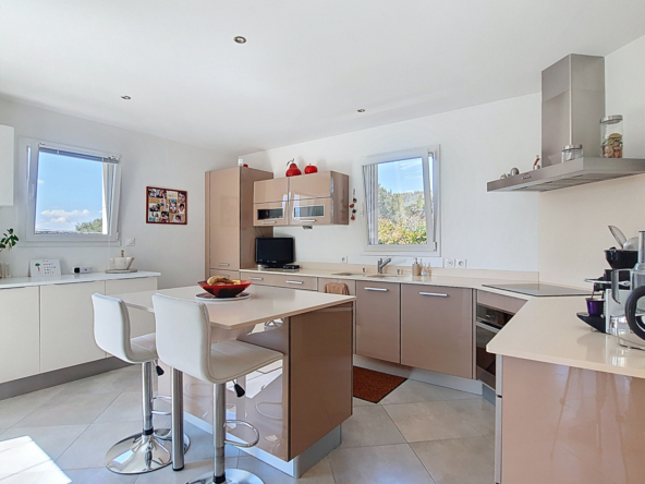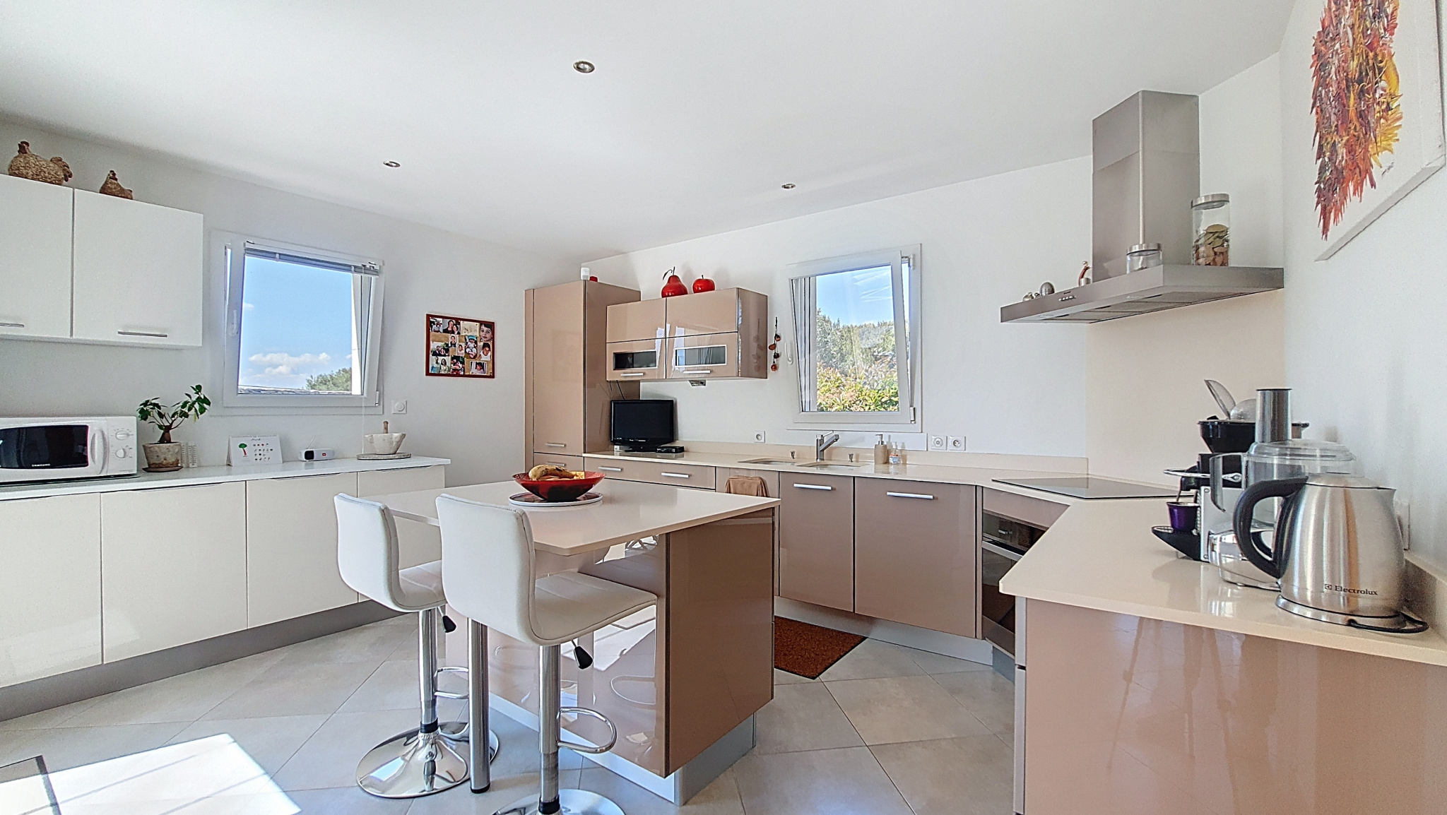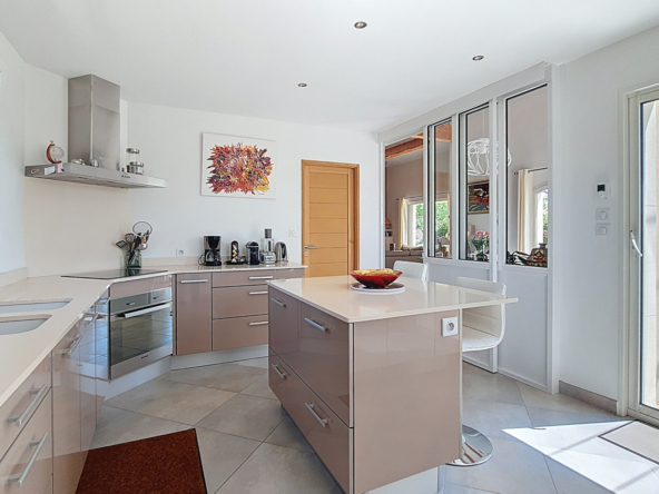 La maison se compose: d’un vaste et lumineux séjour-salle à manger agrémenté d’un impressionnant plafond cathédrale, créant un volume et une atmosphère unique , d’une cuisine entièrement équipée donnant accès sur une terrasse.