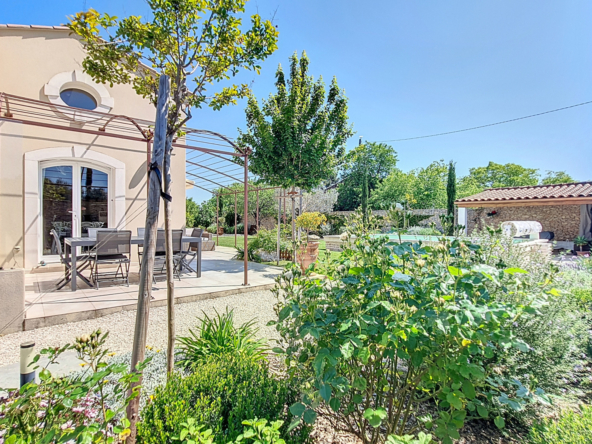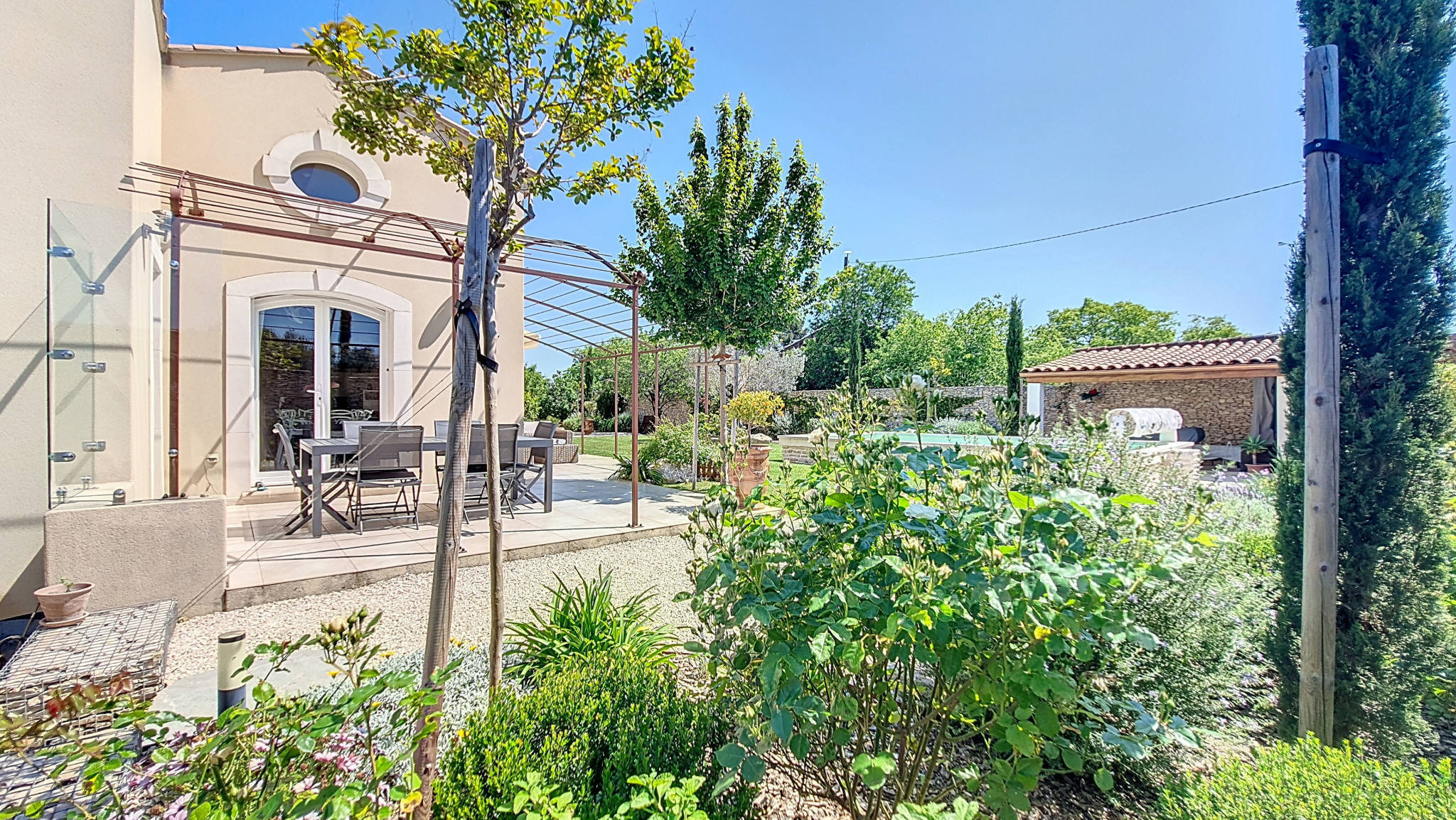 Un jardin paysager soigneusement entretenu avec sa piscine rafraîchissante et son pool house, véritable invitation à la détente et aux loisirs en extérieur.
