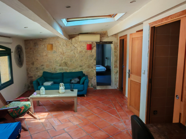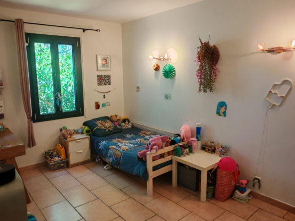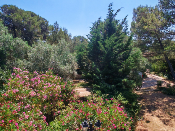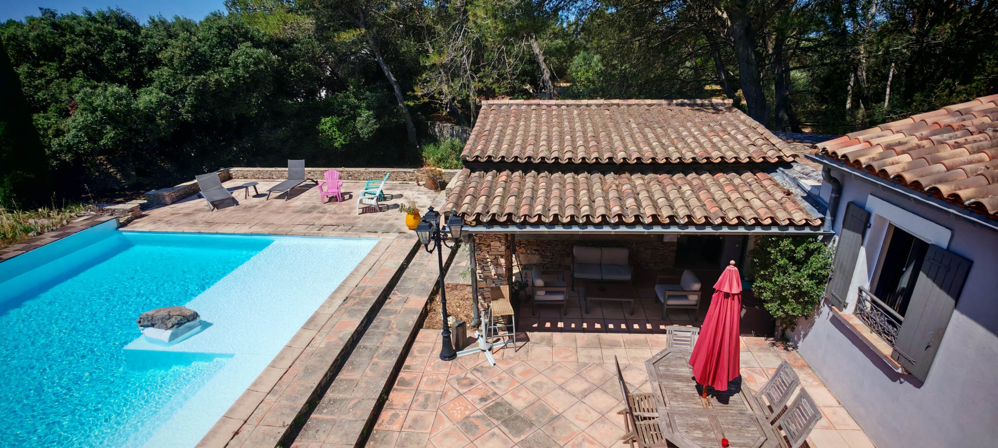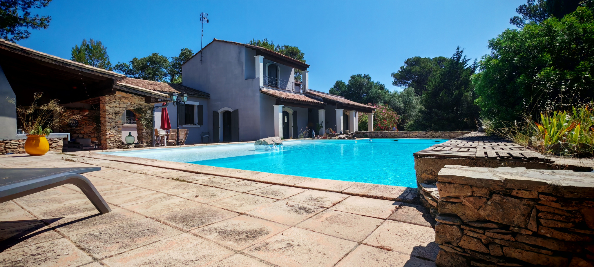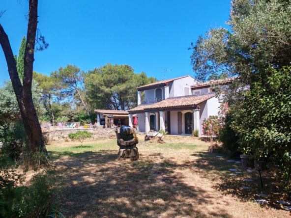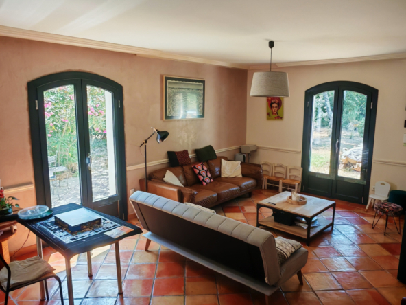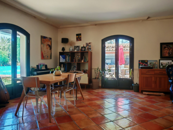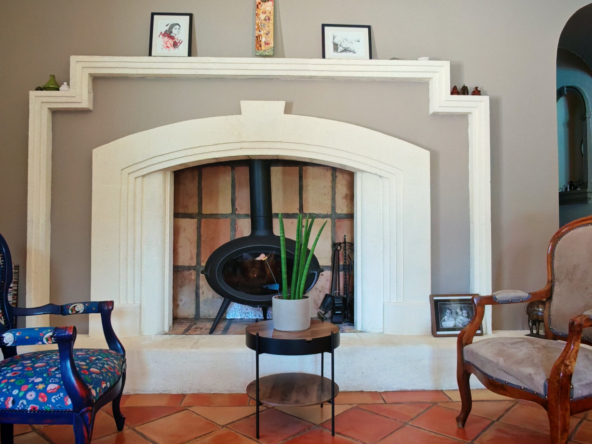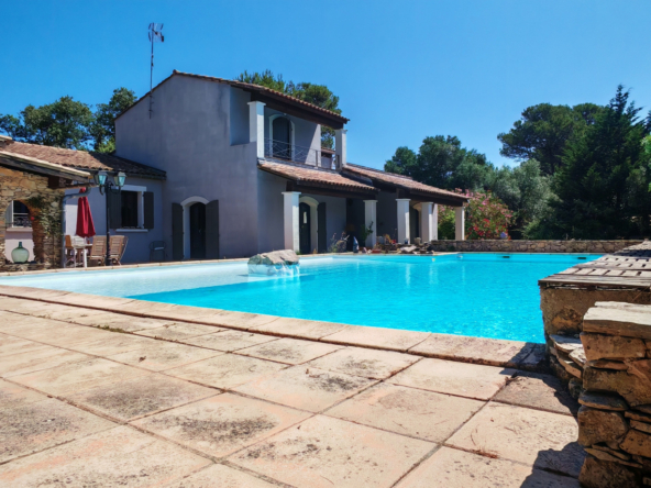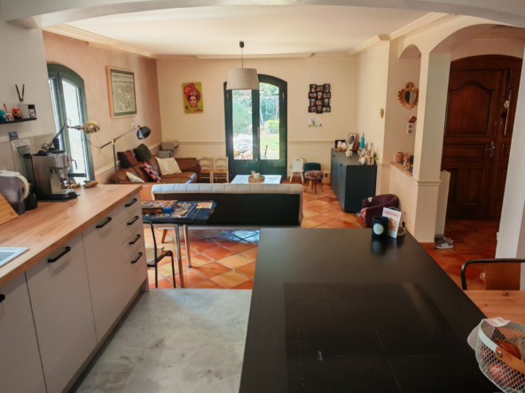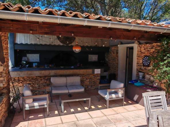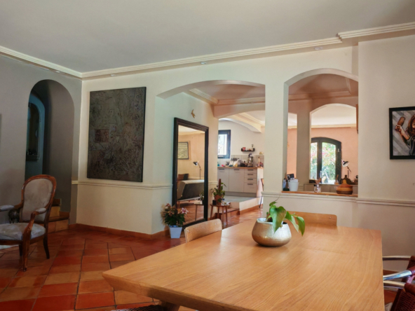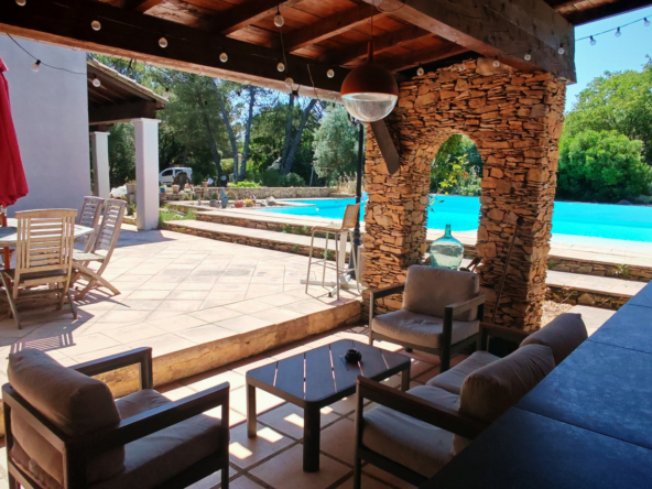 Le salon, quant à lui, donne directement sur une vaste terrasse, véritable invitation à la détente et aux moments partagés. Elle mène à une piscine accueillante et est agrémentée d’une magnifique cuisine d’été en pierre, promesse de repas ensoleillés et de souvenirs inoubliables en famille ou entre amis.