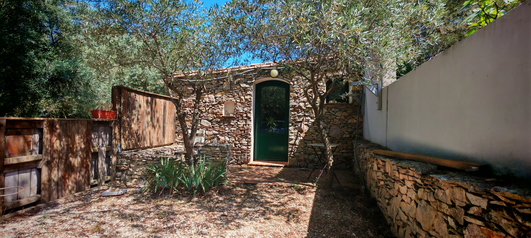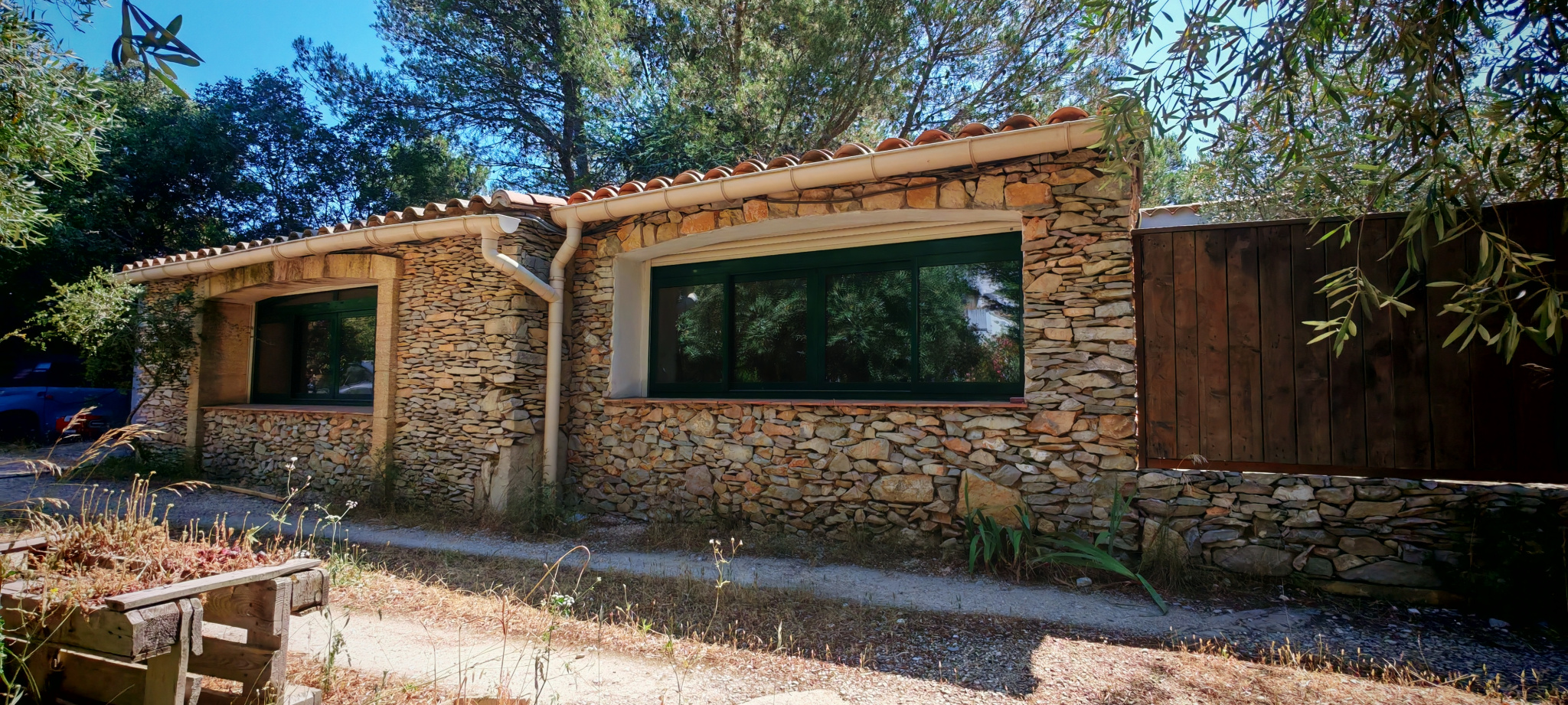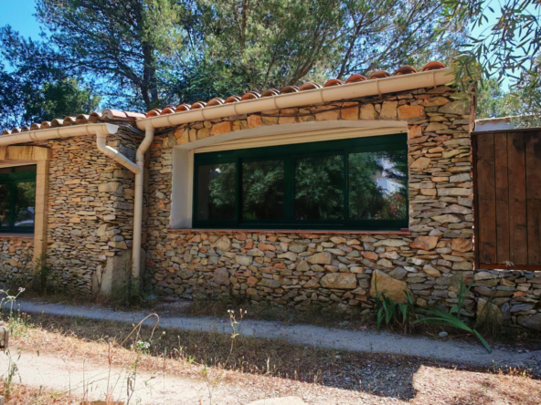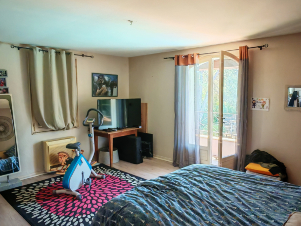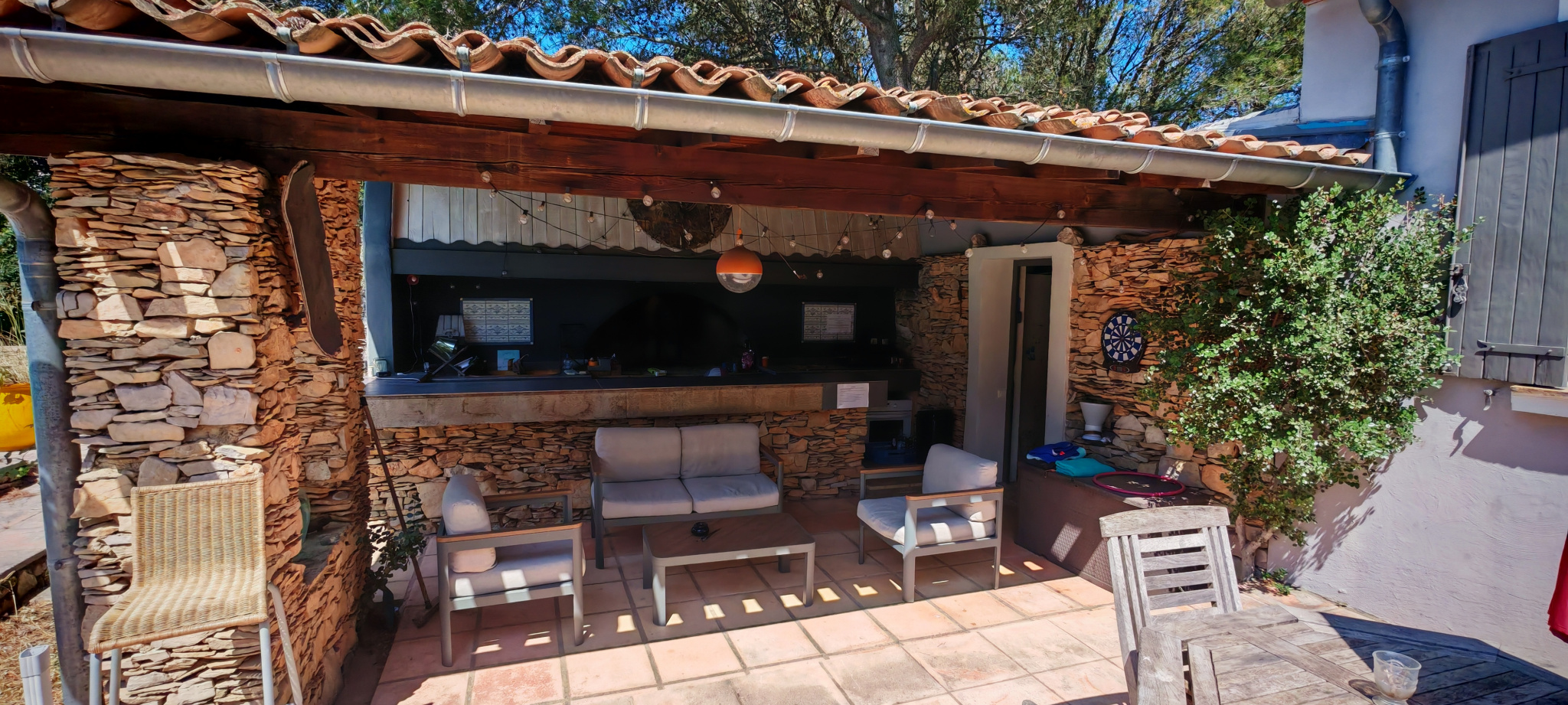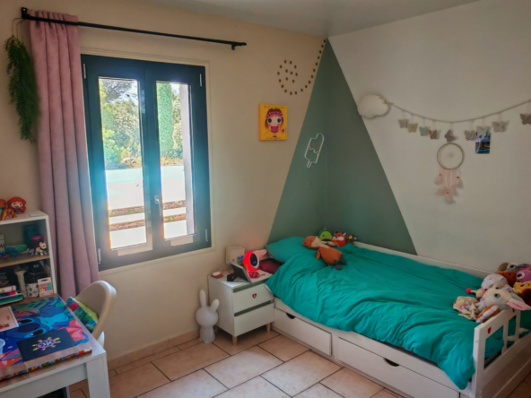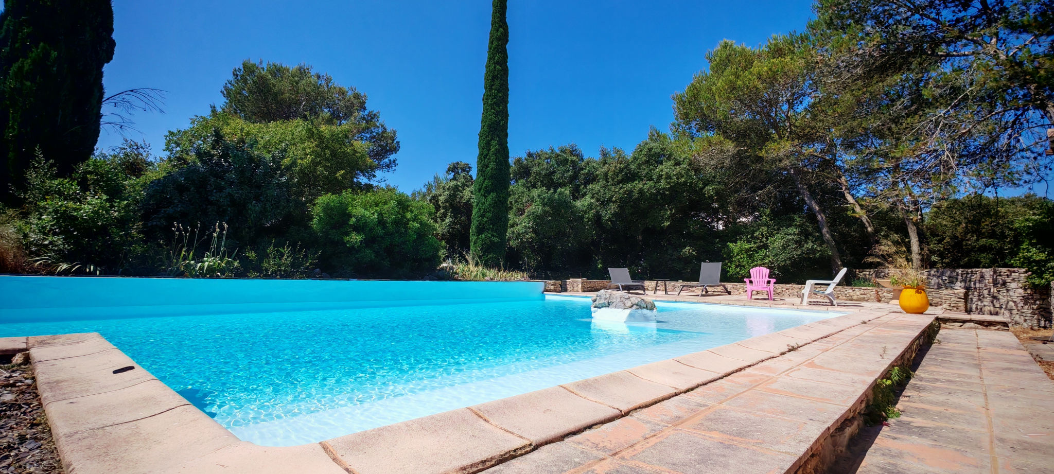 Le salon, quant à lui, donne directement sur une vaste terrasse, véritable invitation à la détente et aux moments partagés. Elle mène à une piscine accueillante et est agrémentée d’une magnifique cuisine d’été en pierre, promesse de repas ensoleillés et de souvenirs inoubliables en famille ou entre amis.