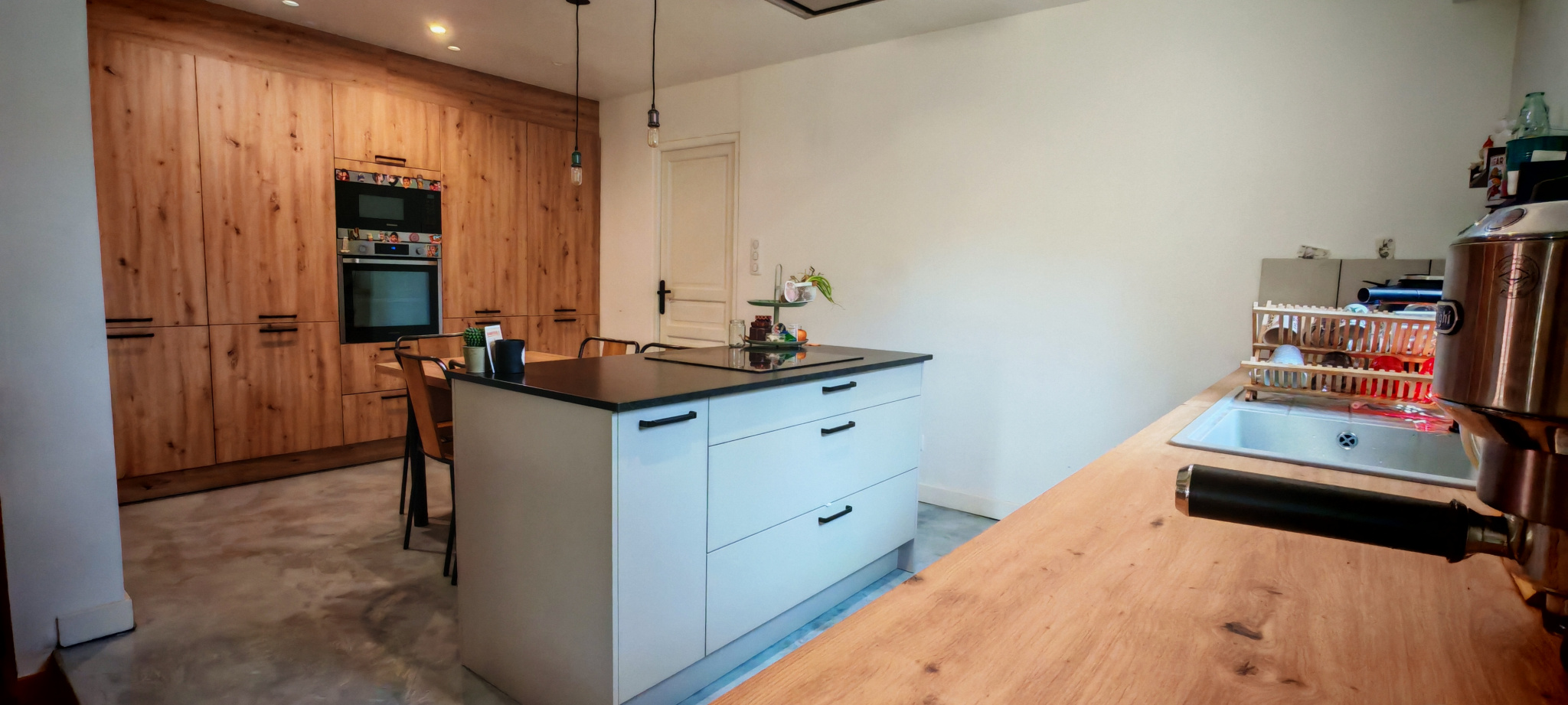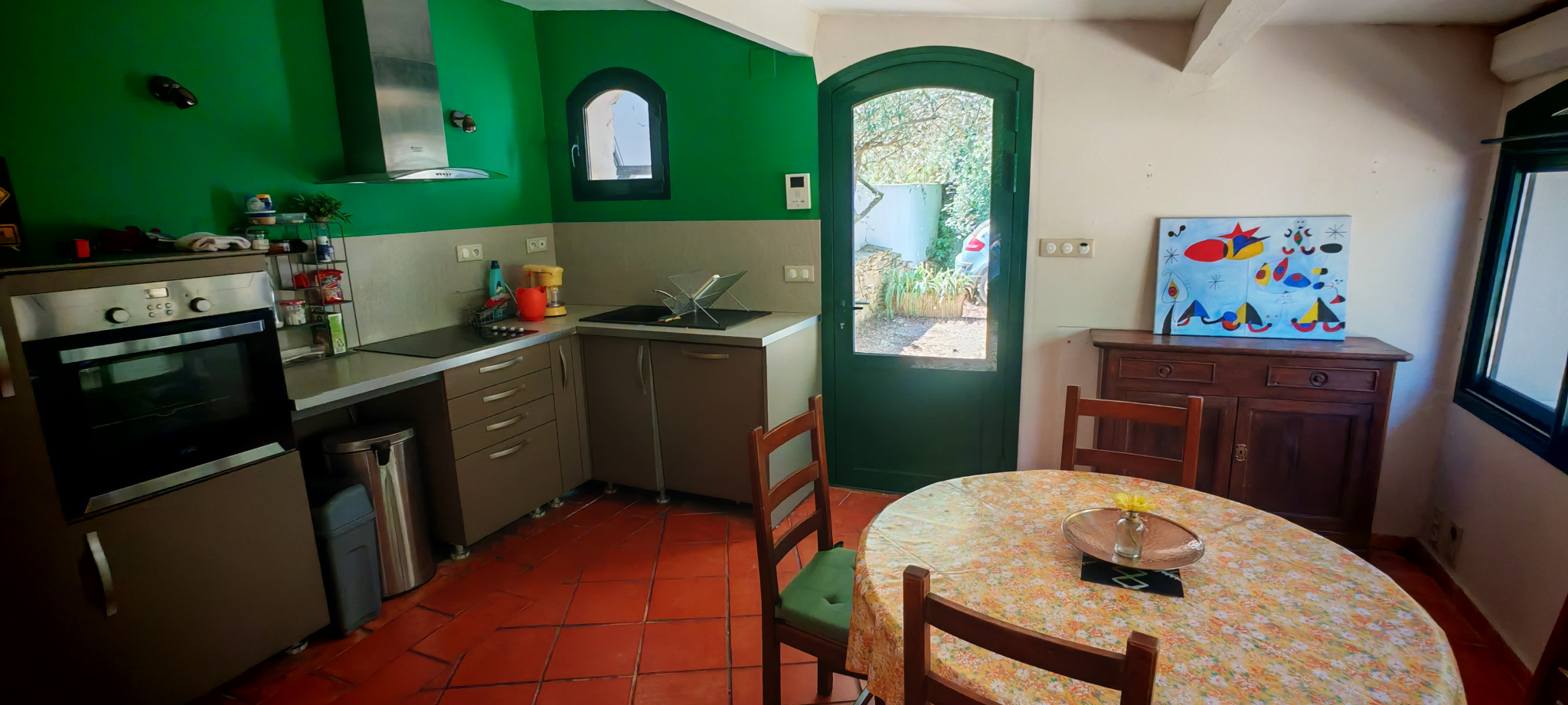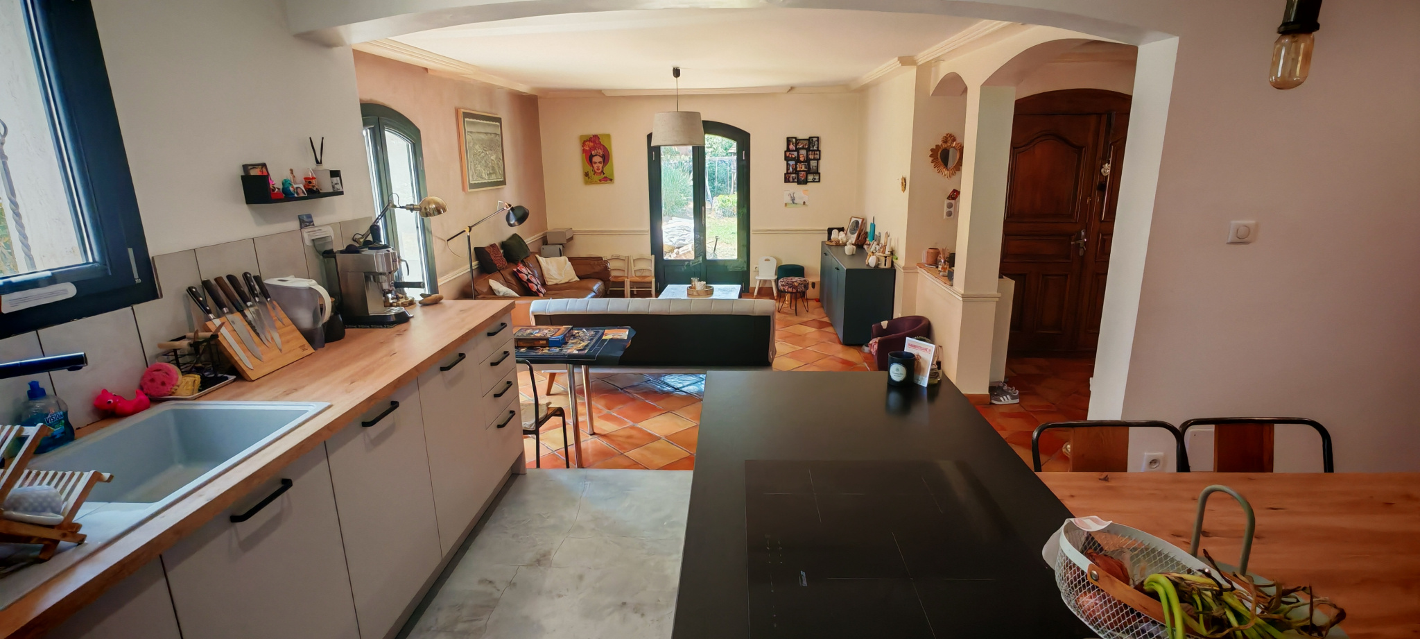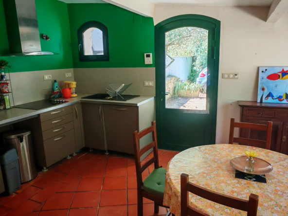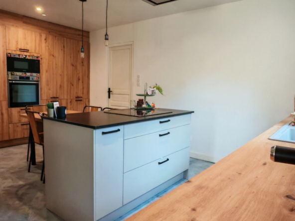 La salle à manger s’ouvre sur une grande cuisine ouverte, résolument moderne et entièrement équipée d’un îlot central, invitant à la convivialité. Attenant, un cellier fonctionnel mène à une pièce lumineuse aux multiples potentiels : chambre supplémentaire, salle de jeux, atelier d’artiste… laissez libre cours à vos envies.