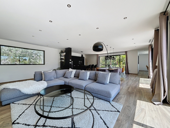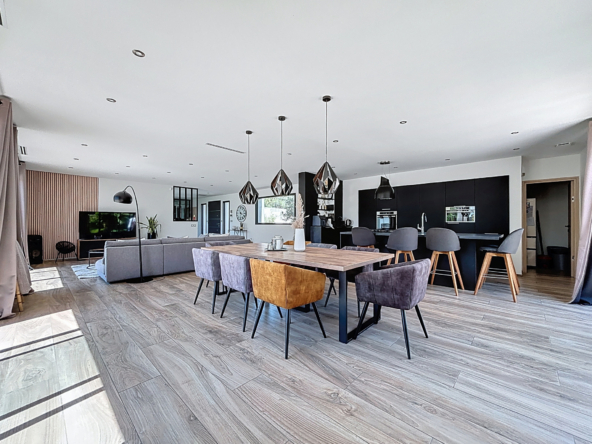 Une vaste pièce de vie idéale pour la réception, intégrant le salon la salle à manger et la cuisine équipée et aménagée