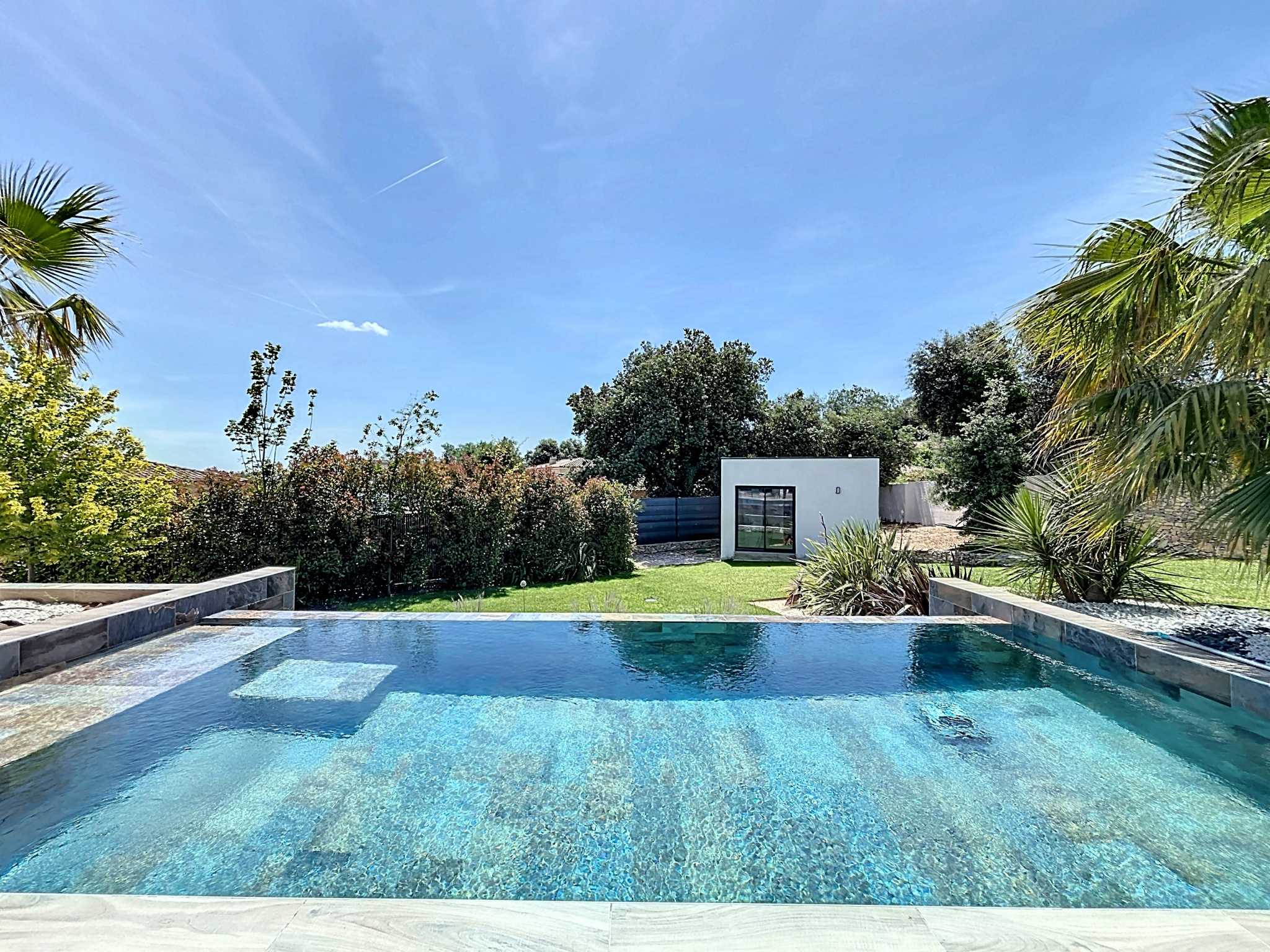 Une piscine à débordement en carrelage Balinais avec filtration au sel, profitant par son exposition d’une une luminosité exceptionnelle du matin au soir.