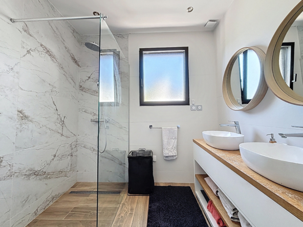 Récapitulatif des Prestations : Adoucisseur d’eau, Domotique, Alarme, Fenêtre Aluminium, Baies coulissantes, Double vitrage, Fibre Optique, Thermostat connecté, Volets roulants électriques, Arrosage Intégré, Clôtures, Interphone-Visiophone, Air conditionné Gainable Airzone, Vide sanitaire, Eclairage extérieur, Portail électrique, Piscine à débordement au sel, Porte blindée.