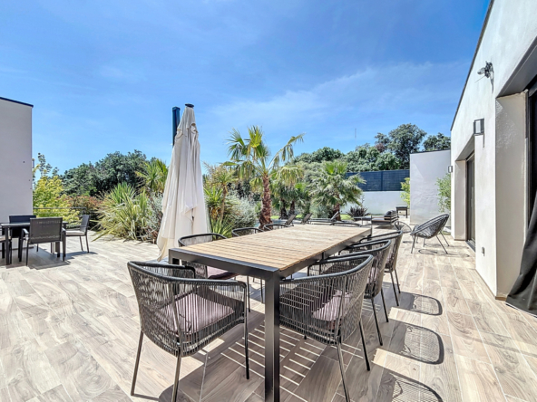 Un accès direct à une vaste terrasse exposée plein sud et desservant l’espace piscine.