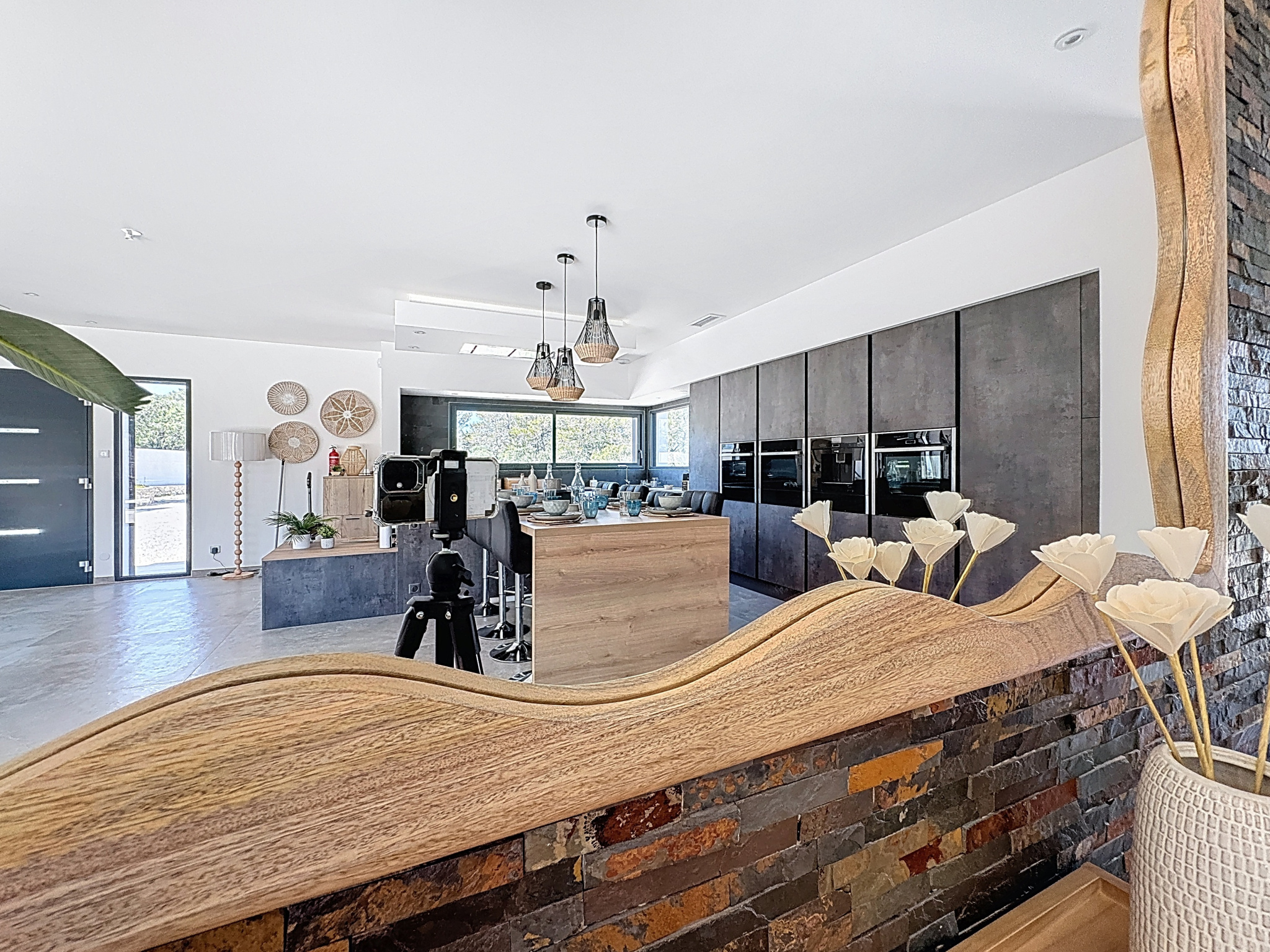 L&L real estate is delighted to present to you this sumptuous contemporary property, ideally located on the hills of Nîmes. Built on a plot of 3000 m2, this house offers an exceptional living environment, combining comfort, elegance and tranquility. Built in 2022, this spacious villa covers a living area of 338 m2. As soon as you enter, you will be seduced by a large living-dining room of 100 m2, bathed in natural light, with a fully equipped kitchen. The large bay windows allow you to enjoy direct access to a magnificent terrace. The main villa, with an area of 215 m2, includes a living space including the living room/kitchen, the real heart of the house. You will also find a master suite with a spacious bedroom, a functional dressing room and a private bathroom. In addition, three additional bedrooms, corresponding to 14 m2, 15 m2 and 16 m2 respectively, as well as a second bathroom, will offer you a comfortable and welcoming space for the whole family.The lower level of the house also offers an outbuilding of 120 m2 of living space, accessible either from inside the house or independently through its own gate. This versatile space can be arranged to suit your needs and can serve as an office, leisure space or even guest accommodation. Additionally, the property has a spacious 120 m2 cellar and a garage to meet all your storage needs.The 3000 m2 garden, fully enclosed, offers ample space for your vehicles, as well as a terrace area where you can relax and enjoy convivial moments outdoors. A magnificent salt pool completes this idyllic outdoor space, inviting you to cool off on hot summer days. Additionally, the house is equipped with exterior surveillance cameras and an alarm system to ensure your peace of mind.Don’t miss this exceptional opportunity to acquire a prestigious residence on the heights of Nîmes. Contact us now to schedule a visit and discover all the advantages this one-of-a-kind home offers.
