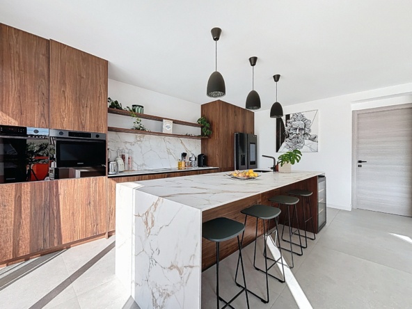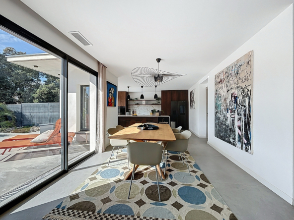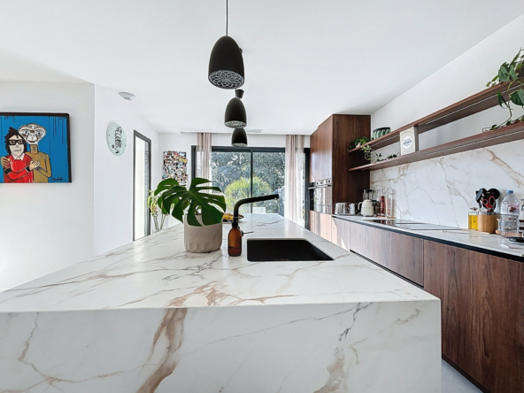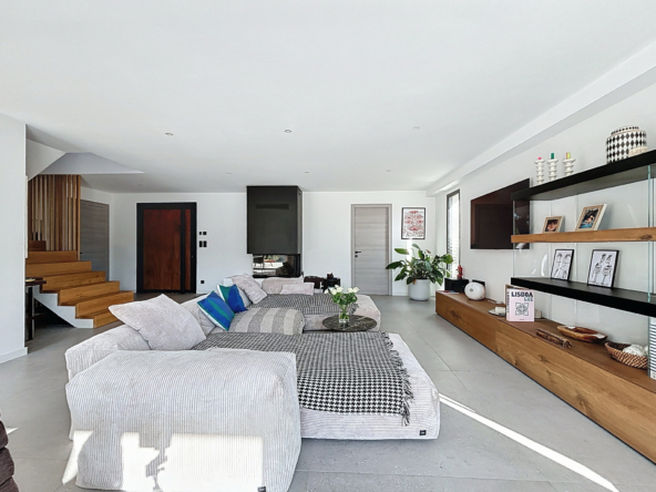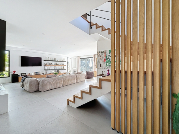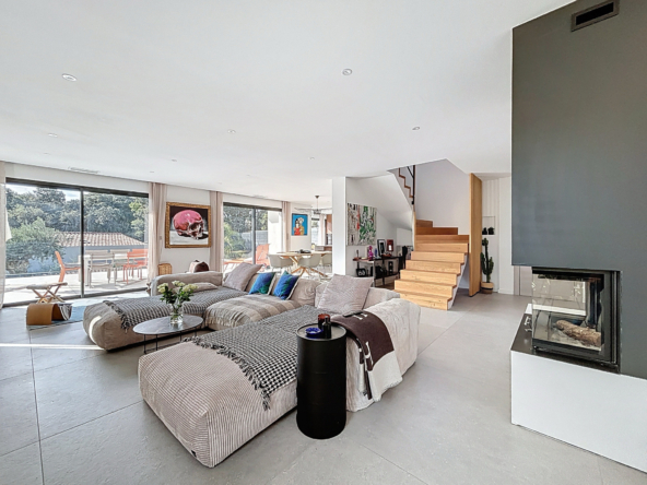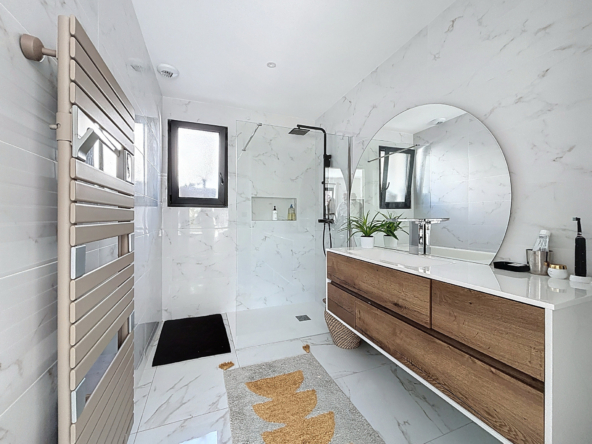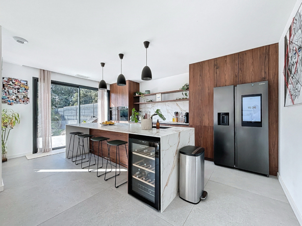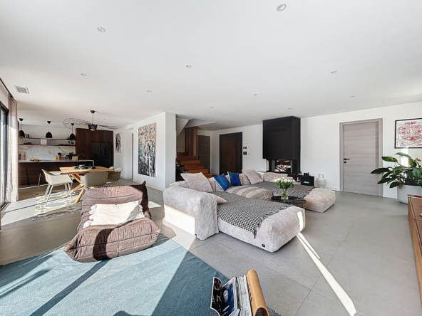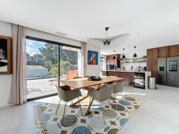 Le rez-de-chaussée s’organise autour d’un vaste séjour de 82 m2, baigné de lumière grâce à de larges baies vitrées ouvrant sur une terrasse élégante et une piscine à débordement, créant une continuité naturelle entre intérieur et extérieur. La suite parentale offre un espace intime avec dressing sur mesure et salle d’eau privative. Une buanderie, un WC indépendant et un garage viennent compléter ce niveau.