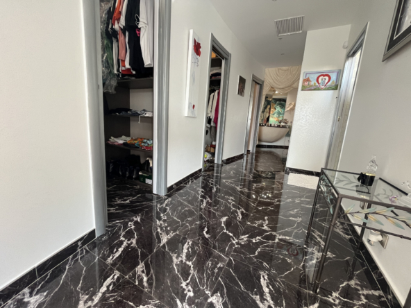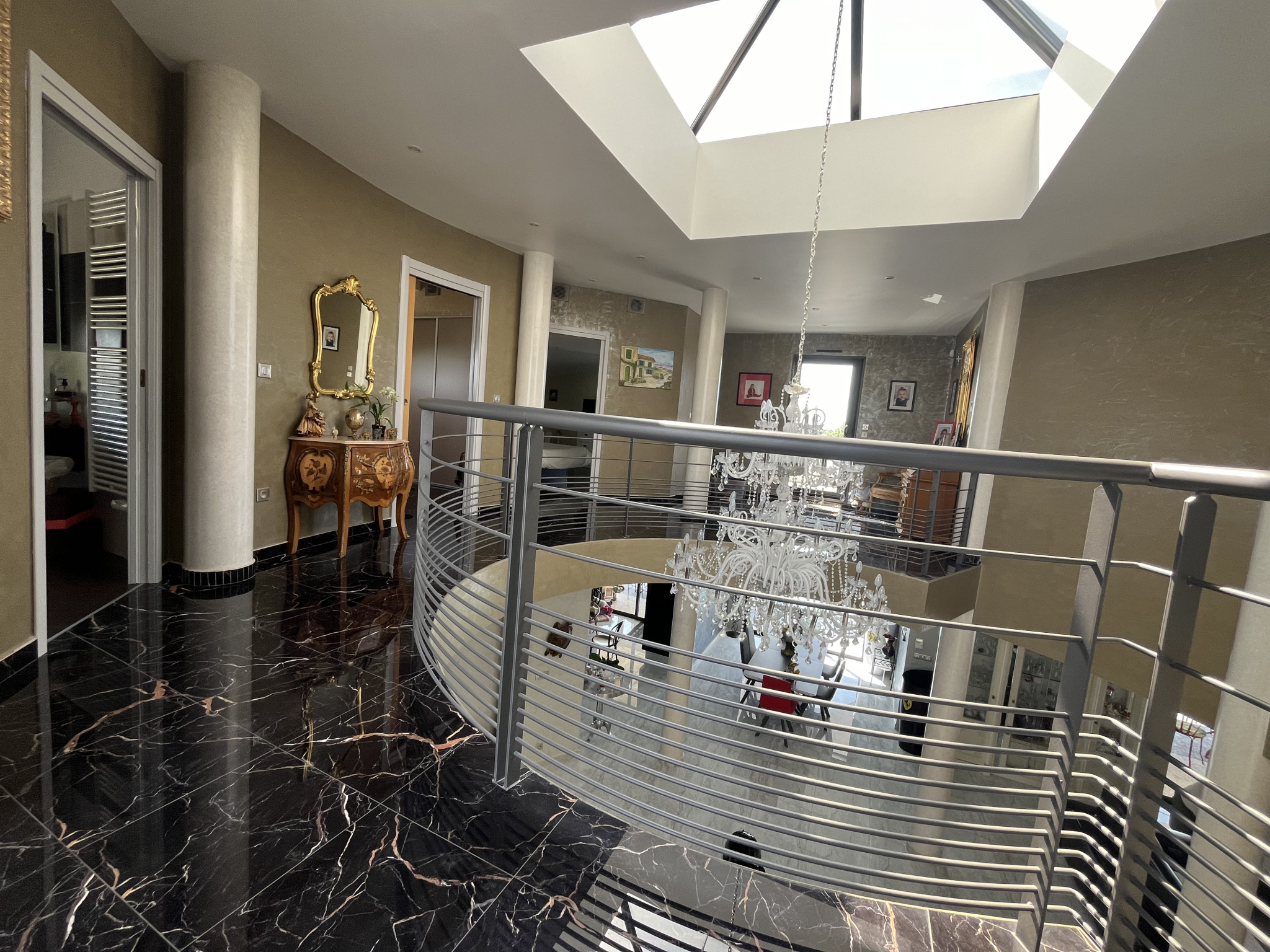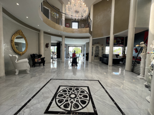 Espaces de vie grandioses : Le hall d’entrée lumineux, la pièce de vie s’ouvrant sur la terrasse et la piscine, ainsi que l’immense suite parentale, témoignent des proportions généreuses de cette demeure.